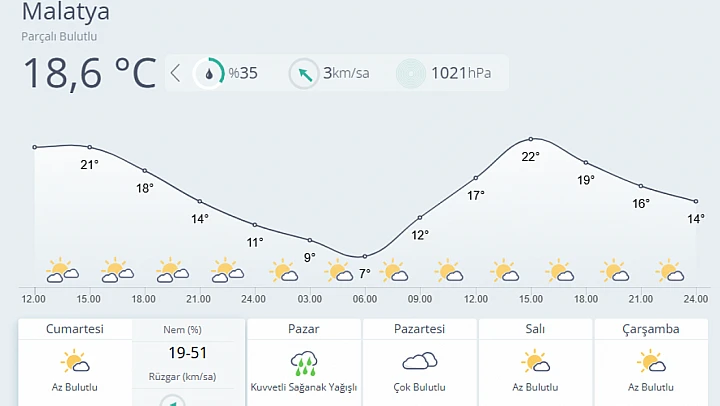 Cumartesi günü hava az bulutlu olacak, sıcaklıklar 7 ila 22 derece arasında değişecek. Ancak pazar günü Malatya'da kuvvetli sağanak yağış bekleniyor. Yağışlarla birlikte hava sıcaklığının 8 ila 22 derece arasında olması tahmin ediliyor.