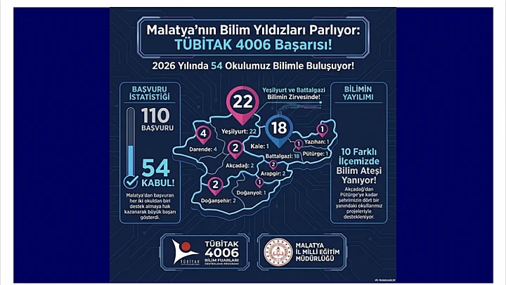 Malatya İl Millî Eğitim Müdürlüğü, TÜBİTAK 4006 Bilim Fuarları Programı kapsamında büyük bir başarıya imza attı. İlimizden başvuru yapan 110 okuldan 54'ü desteklenmeye hak kazanarak bilimsel projelerini sergileme fırsatı yakaladı.