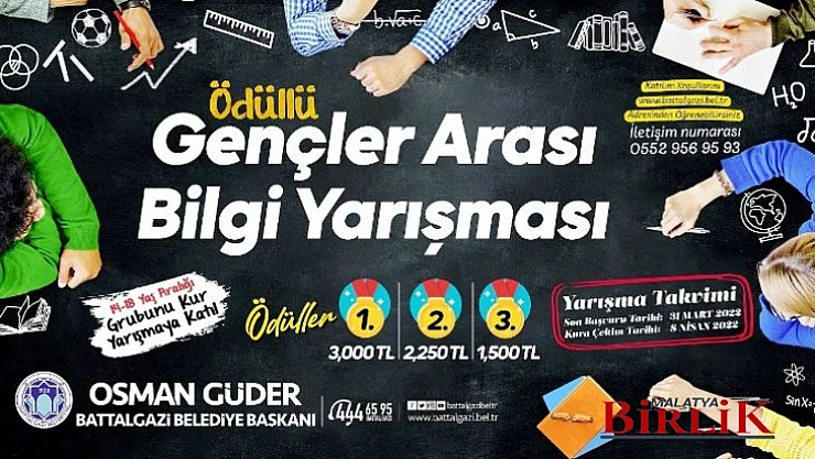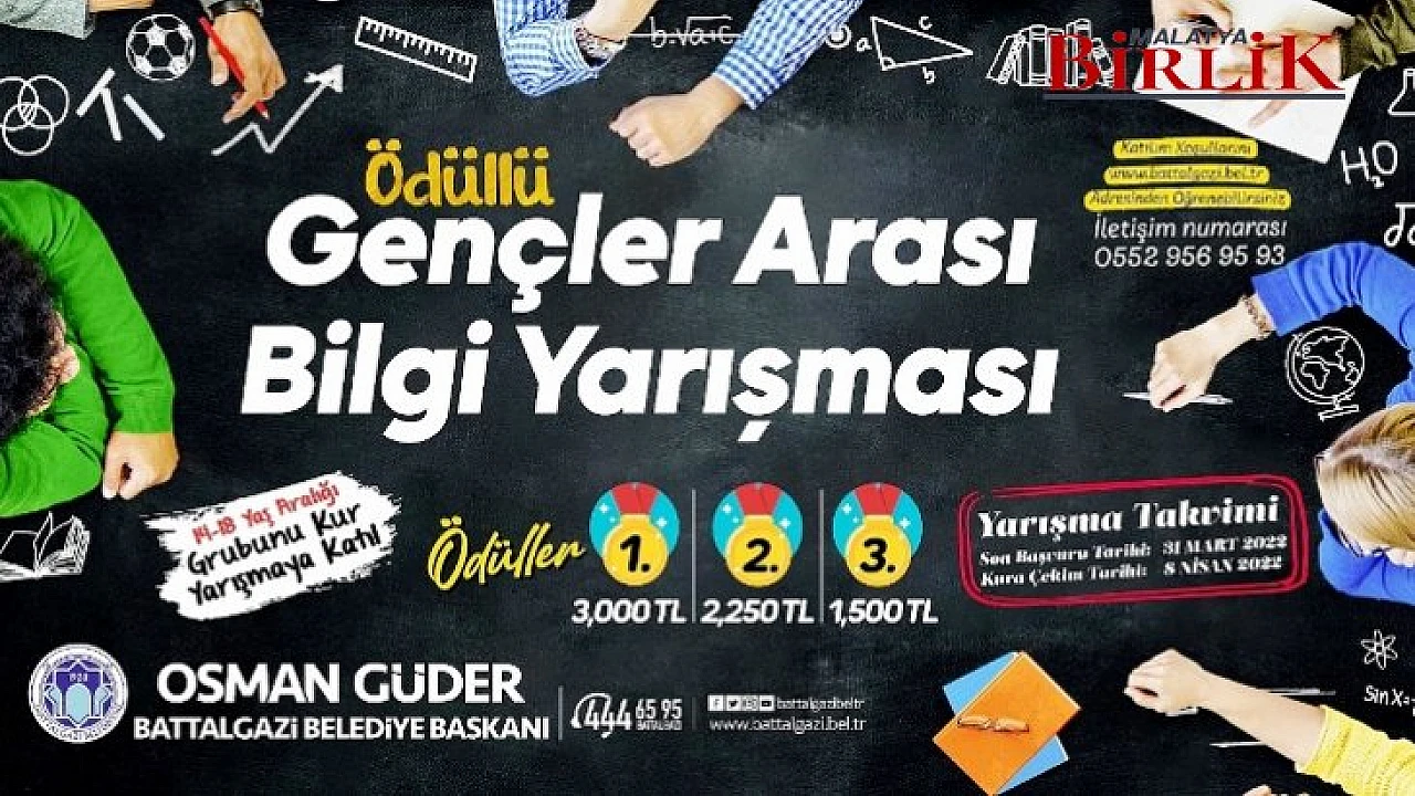 Battalgazi Belediyesi tarafından gençler arasında bilgi paylaşımını yaygınlaştırmak, gençlere yarışma kültürünü kazandırmak amacıyla ödüllü bilgi yarışması düzenliyor. 14-18 yaş arasındaki gençlerin katılım sağlayacağı 3 bin TL ödüllü bilgi yarışması rekabet dolu anlara ev sahipliği yapacak.