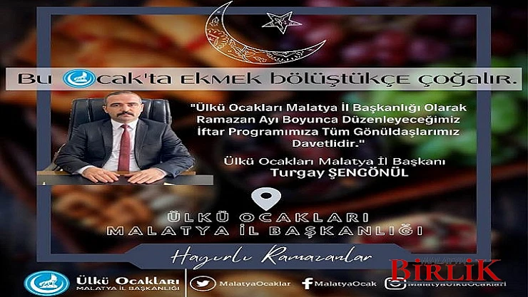 Programla ilgili açıklamalarda bulunan Ülkü Ocakları Malatya İl Başkanı Turgay ŞENGÖNÜL; “Ülkü Ocakları Malatya İl Başkanlığı olarak, Ülkücü şehit ağabeylerimiz ve bu vatan için gözünü kırpmadan canını feda etmiş tüm şehitlerimizin hayrına “ Bu Ocakta Ekmek Bölüştükçe Çoğalır” adıyla, kutlu dergahımız olan, Ülkü Ocakları İl Başkanlığımızda Ramazan Ayı boyunca iftar programı yapacağız.Yapacağımız bu programda, helal soframıza tüm gönüldaşlarımızı ve vatandaşlarımızı davet ediyorum” dedi.